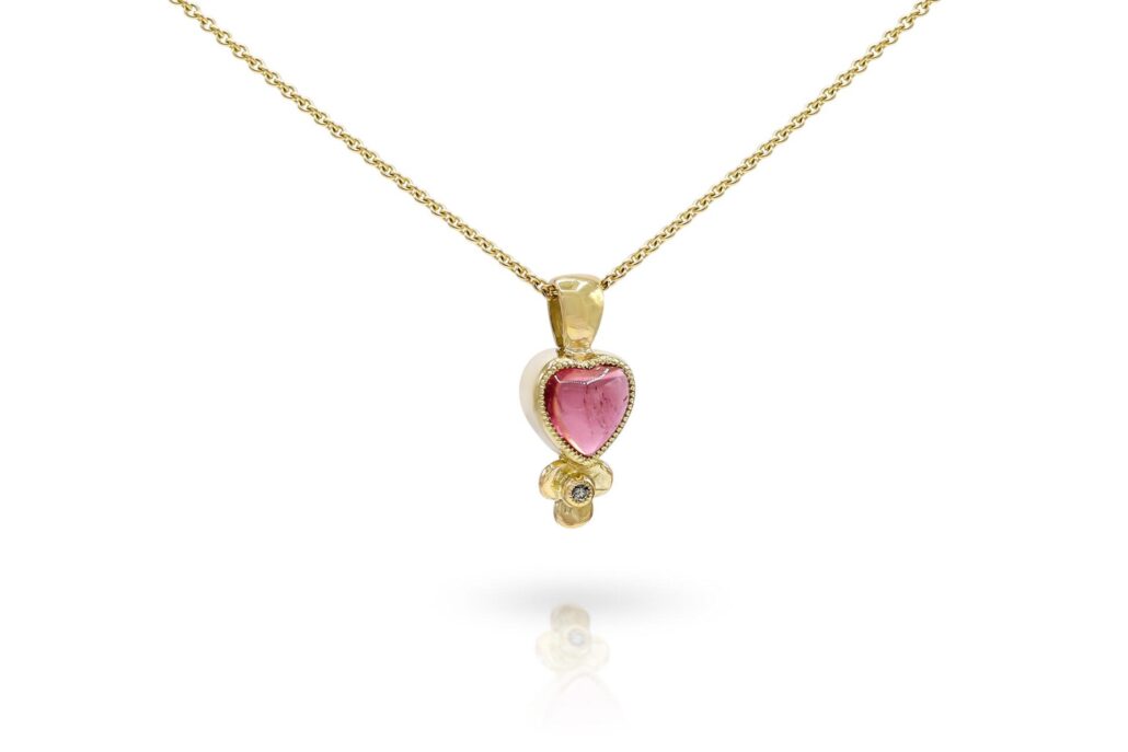 Gouden hanger met een hartvormige roze toermalijn, met daaronder in de bloem, een groene diamant.