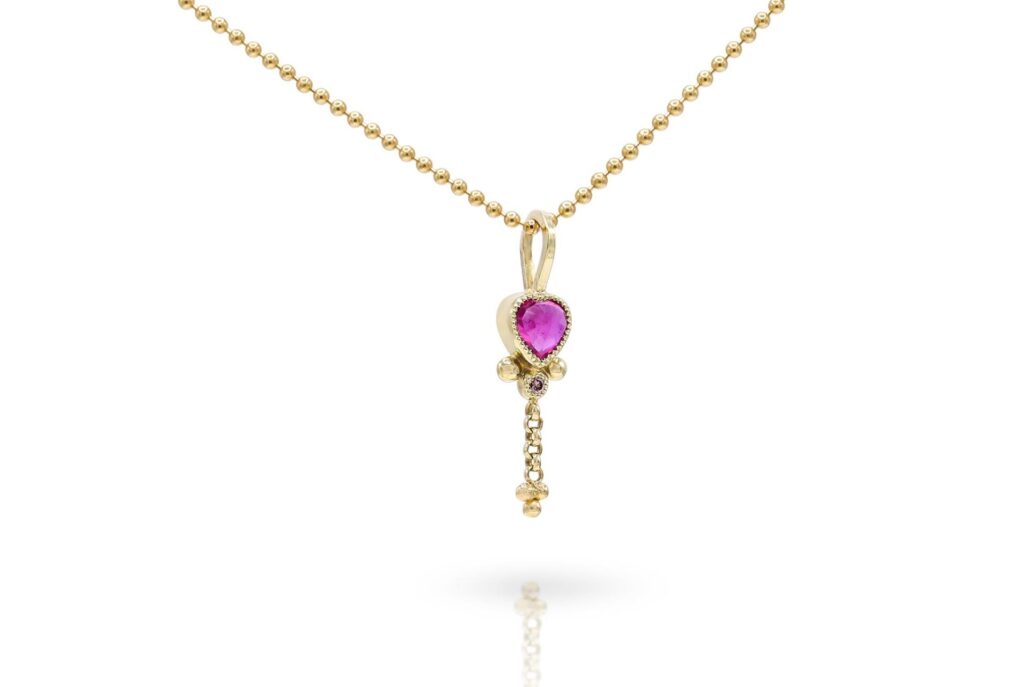 Gouden hanger met hartvormige robijn met daaronder een zacht roze diamant.