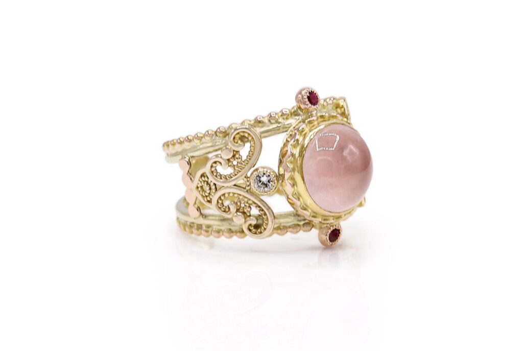 Opengewerkte gouden ring met rozenkwarts, robijn en diamant
