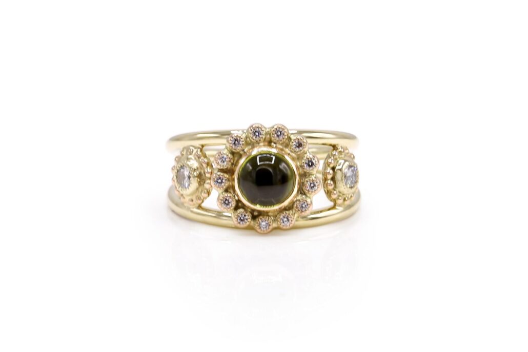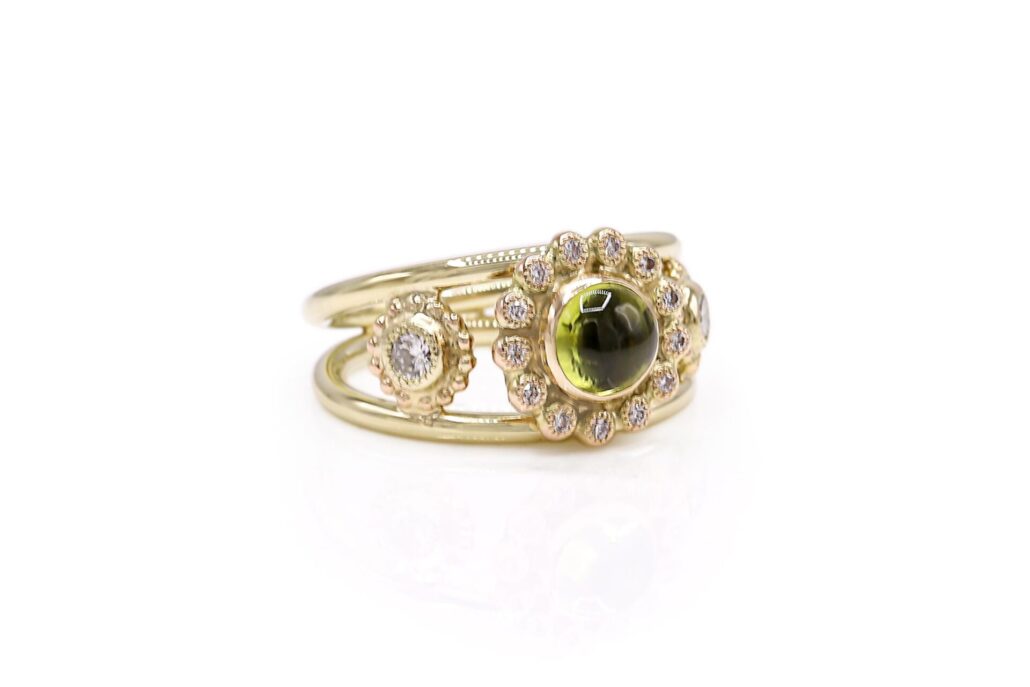 handgemaakte aparte gouden ring met peridot en diamanten