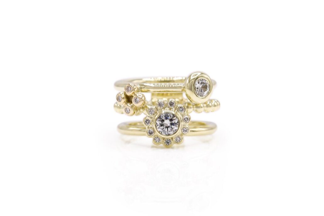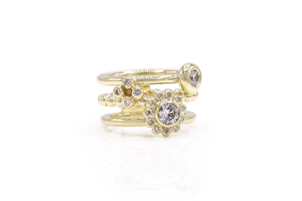 Deze ring is vervaardigd uit geelgoud en is bezet met diamanten in de zettingen, die een prachtige schittering creëren. Aan de onderzijde van de ring is een tussenstuk toegevoegd, waardoor er ruimte ontstaat tussen de gouden ringen.